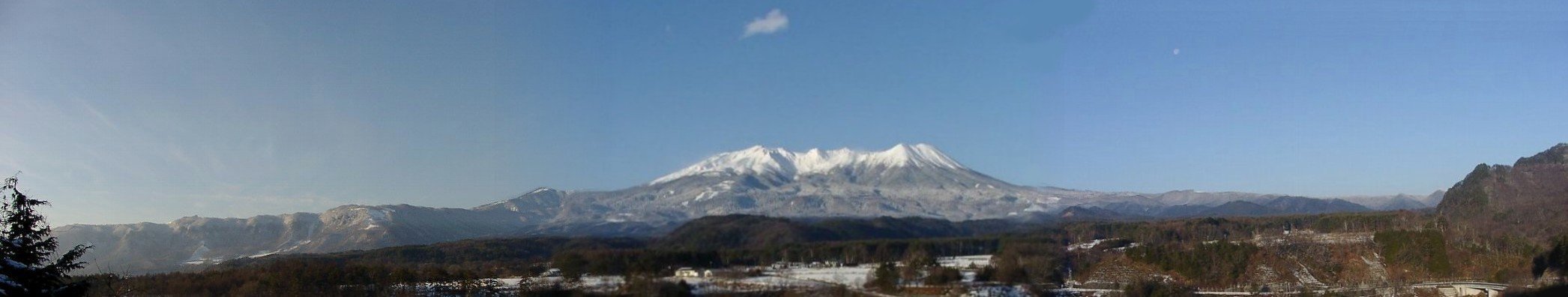 開田高原マイアスキー場への途中に見えた「御嶽山」 の眺め 。 雲ひとつと、月ひとつが見えます。(山の右斜め上)