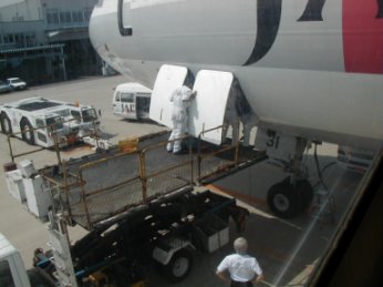 修理クルーが機内、機外で、修理開始。