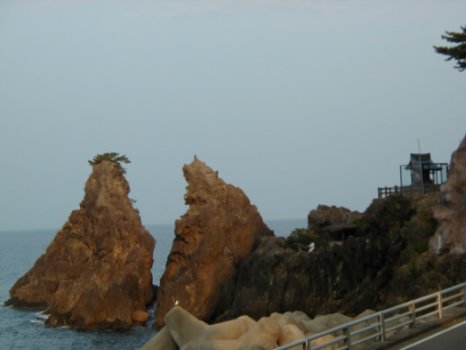 | 翌朝、宿の前の、朝日をあびるエビス岩と船神様の祠 |