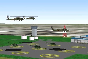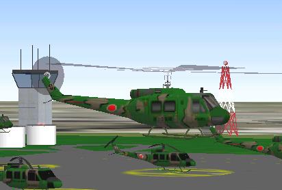ASD2.1で配置した90式戦車、73式装甲車、73式トラックの上空を FS Action! scenery(動くオブジェクト編)のダイナミックシナリで、UH-1.CH-47、が飛んでいます。