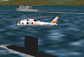 潜水艦の上をホバリングする SH-60J nknsさんの製作機体で飛行中 |