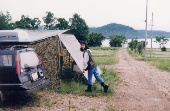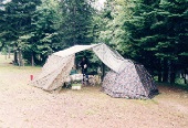 3日目 朝、起きたら雨の重みで自作接続の迷彩タープの接続部分が外れてしまっていた。
