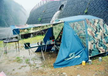 トイレは水洗、川の対岸に温泉あり。 私が行ったときは、台風のあとで、