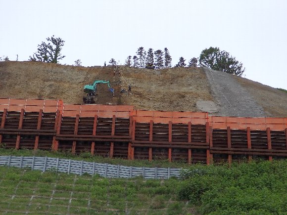 見上げると駐車場の崖を重機が工事をしている。 |
