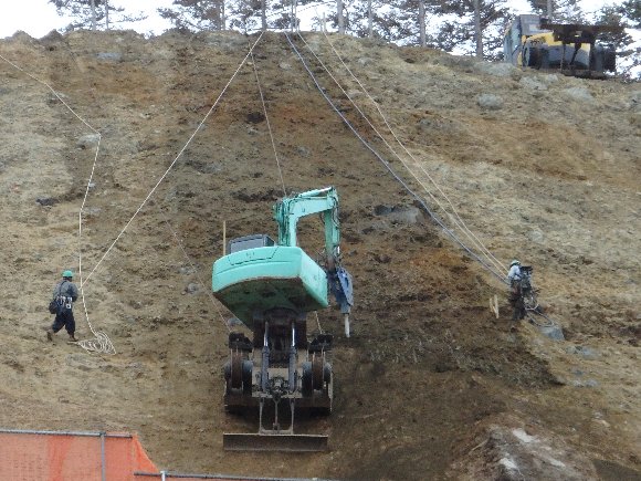 何と! 重機をワイヤーで吊って作業している こんな工法もあるのか! |