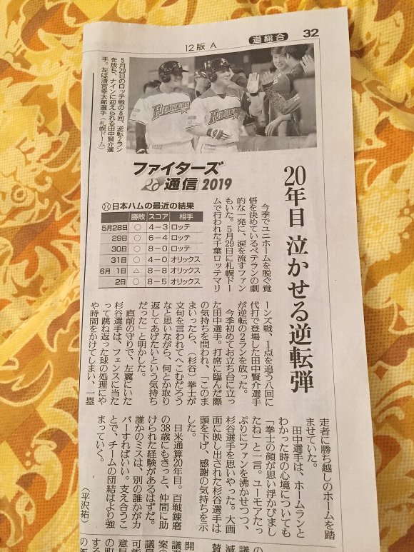 ![]() 5月29日 ロッテ戦 田中賢介の活躍を報道する新聞 |
