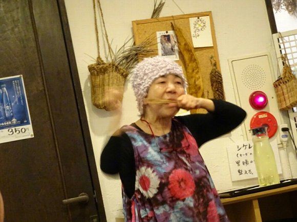夕食時、 大オカミ より 食事の説明 アイヌ民族の悲しい歴史 口にくわえて、 ビヨ〜ン、ビヨ〜ン と鳴らす 楽器の演奏など 独演会を楽しみながらの食事であった。 |