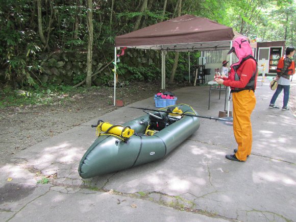 おんたけアドベンチャーさんのベース横で、パックラフト・タンデム艇 を組み立る。