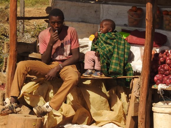 偶然 撮った 物売りの親子? 歯磨き? 何か食べてる? |