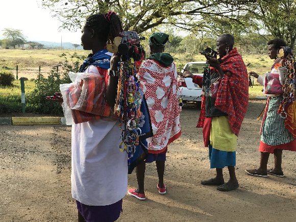 国定公園のゲートの前で停車するとはマサイの女たちが 土産物をひとつ10ドルと車の窓をたたく。