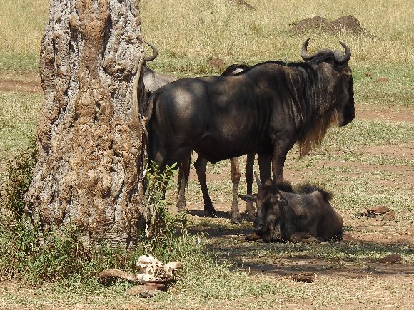 ヌーの親子の脇の樹の下には、ヌーの頭骸骨が |