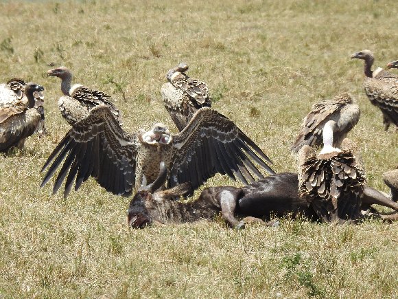 ヌーを食べるハゲワシの群れ |