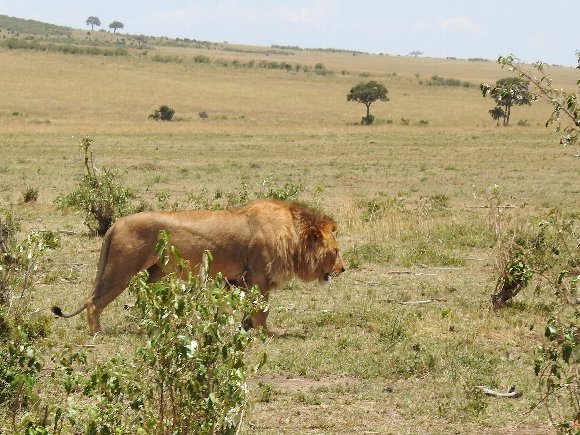 真昼間に歩く雄ライオン |