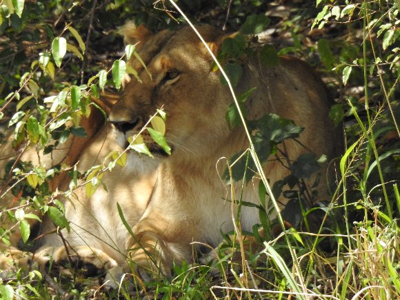 木陰でくつろぐ雌ライオン |