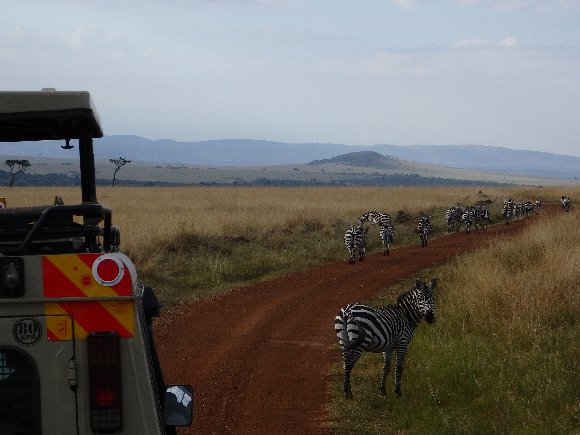 道路を歩くシマウマの群れ |