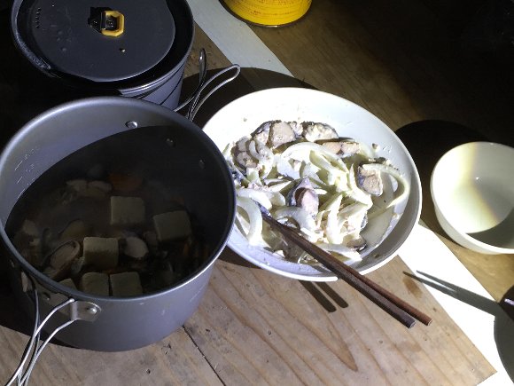 16時ごろ高塚小屋に到着、 暗くなる前に寝床を設定 濡れた衣服を着替える。