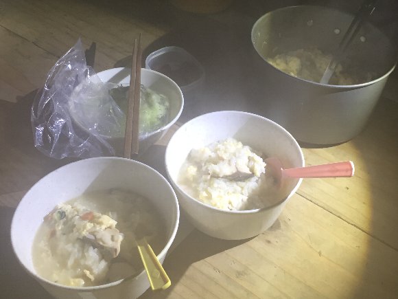 朝食は温かい雑炊 と 浅漬け漬物 |