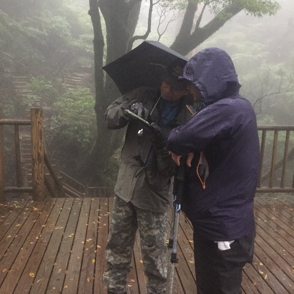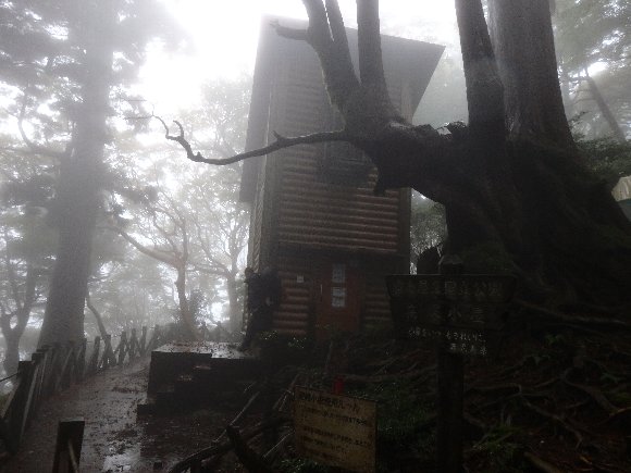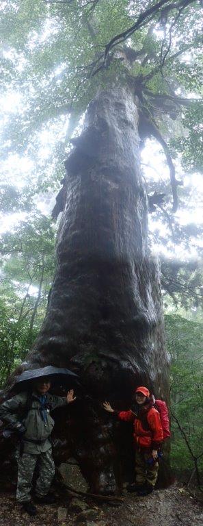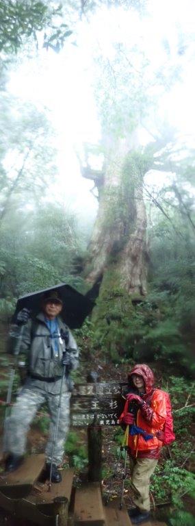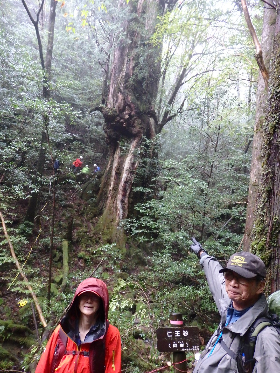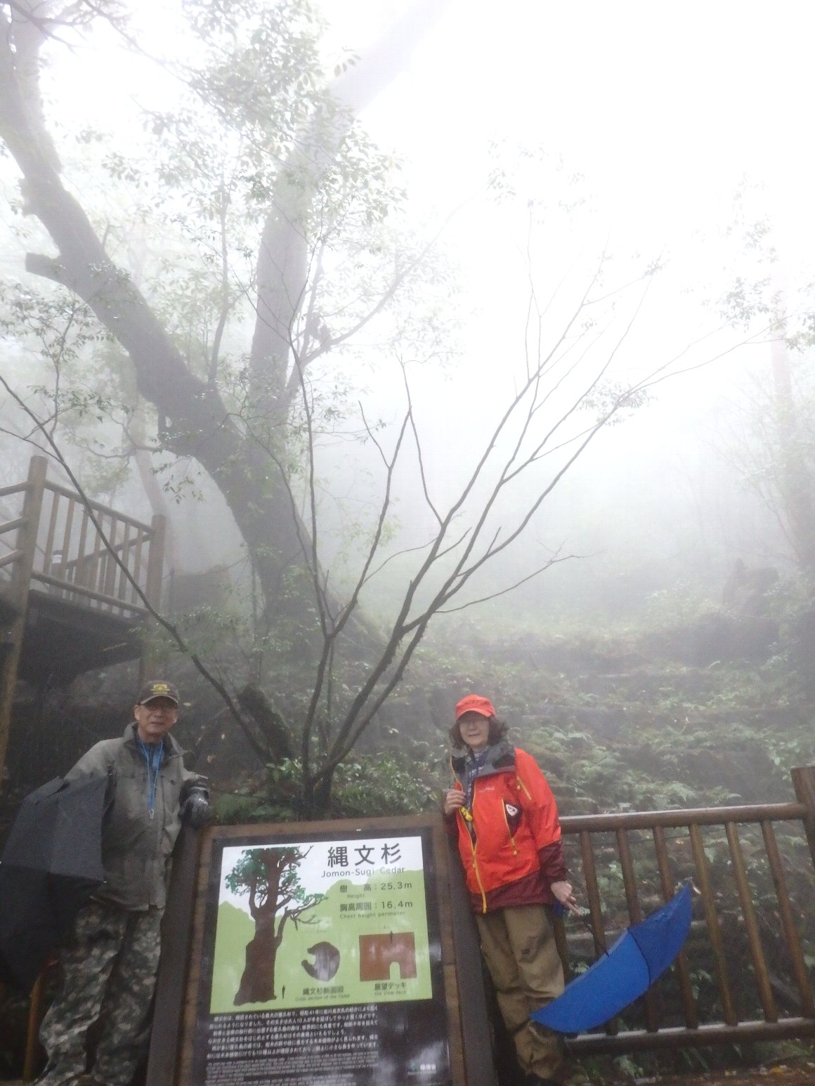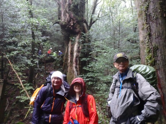 雨が酷く縄文杉がみえない、霧の記念写真となってしまった。