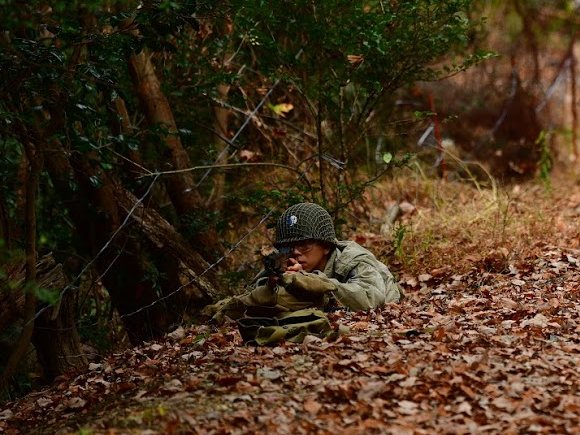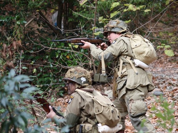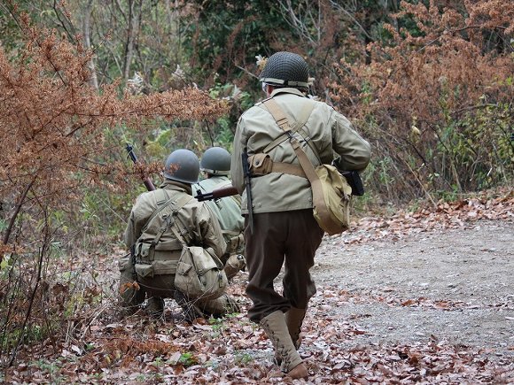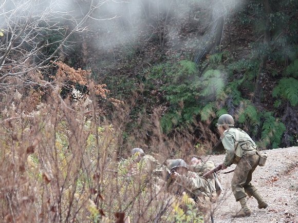 我がアメリカ軍歩兵 第一分隊は 先行して進み 敵機関銃陣地を 砲撃指示