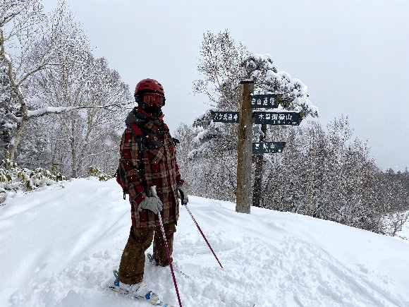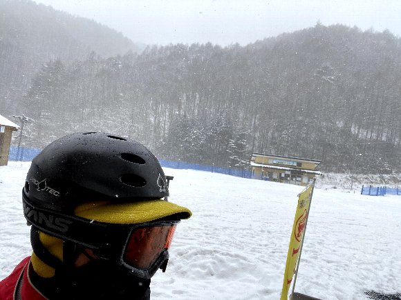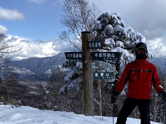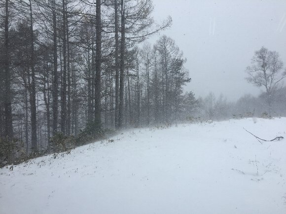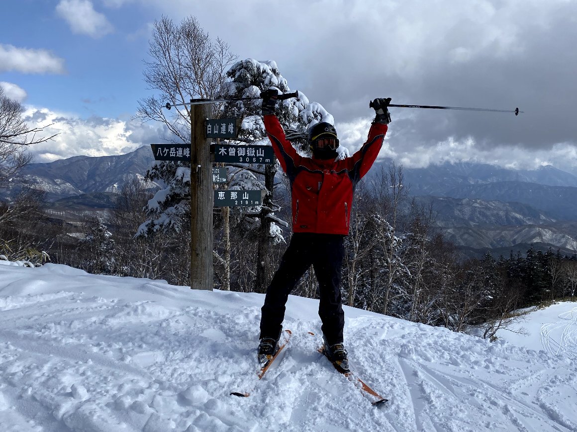 一日目 きそふくしまスキー場 最上部 朝から雪が降り続いていたが、午後3時頃青空が見えて晴れた! 雪は新雪パウダーふわふわフカフカ |