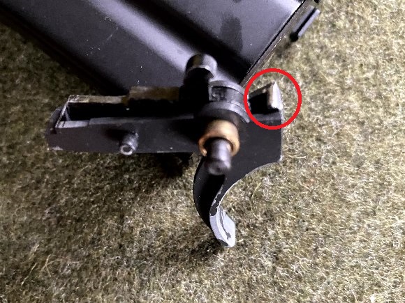 トリガーパーツの摩耗の点検をすると ダイキャスト製のパーツが削れてしまっている。