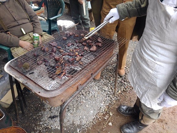 ![]() 伊豆の山奥で 獲れた 鹿肉 や 猪肉を焼く |