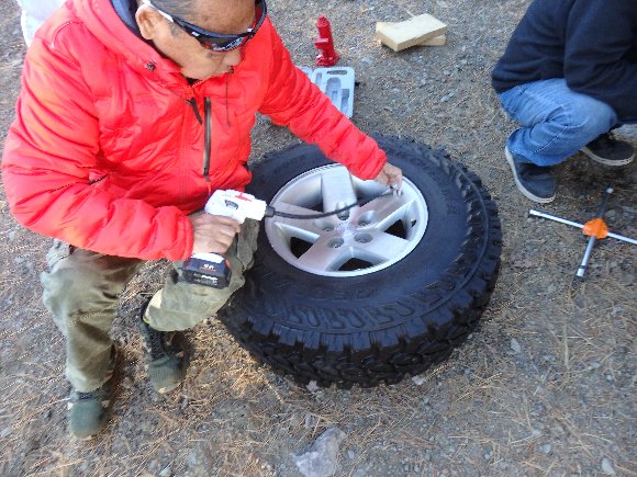 空気圧の少ない スペアタイヤに エアー 注入 |