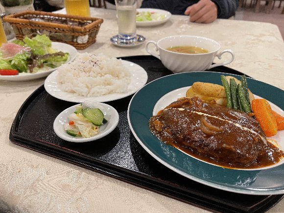 温泉街の 食堂で ランチ