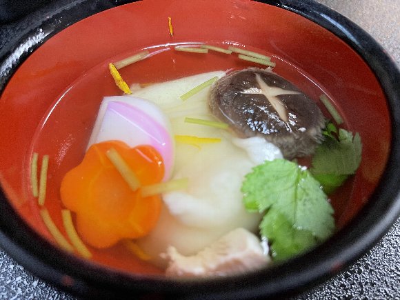![]() 鶏肉の入った すまし汁の お雑煮 |