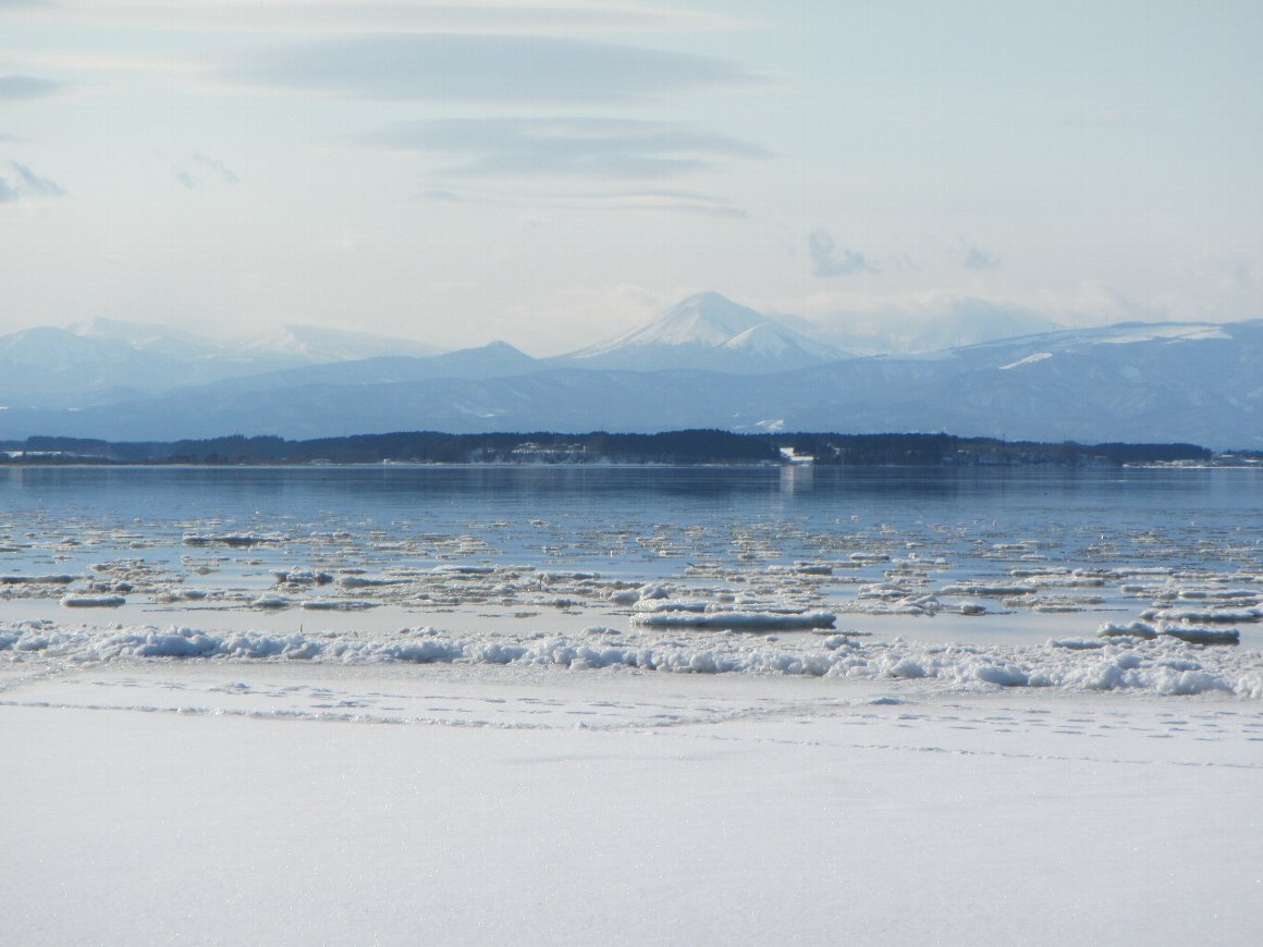 氷の湖の 向こうは 次の日の登る八甲田山が見える |