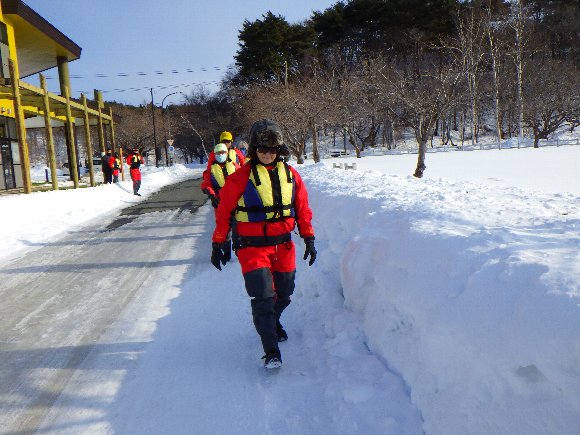 ドライスーツ、ライフジャケットを身につけ |
