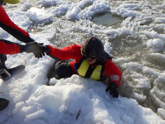 ![]() 踏み跡のない、湖の氷の上を歩く |