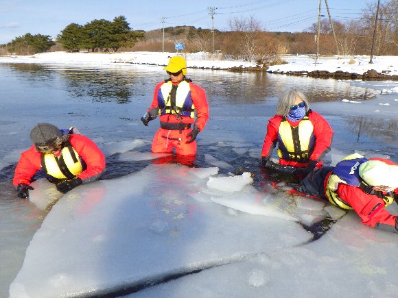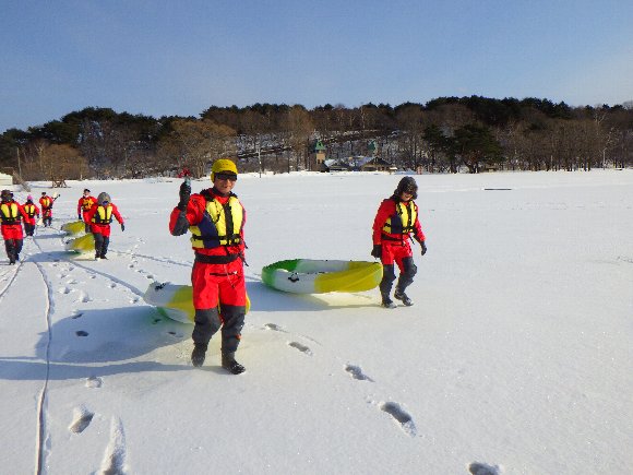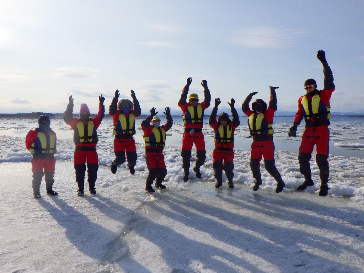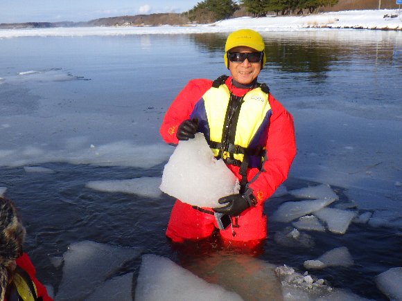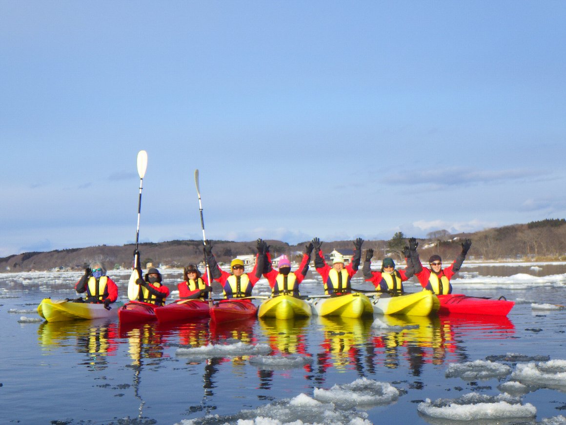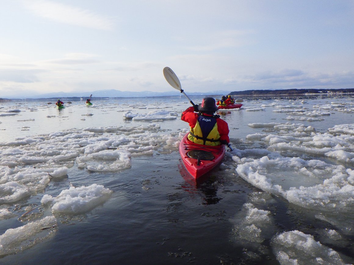 西遊旅行 冬を楽しむ東北ツアー 小川原湖アイスカヤック 八甲田山スノーモンスター 2022.01.23-24 氷の湖を 氷塊を避けながらカヤックを漕ぐ |