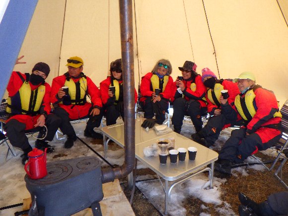 テントに入り、 ホットコーヒーで温まる |