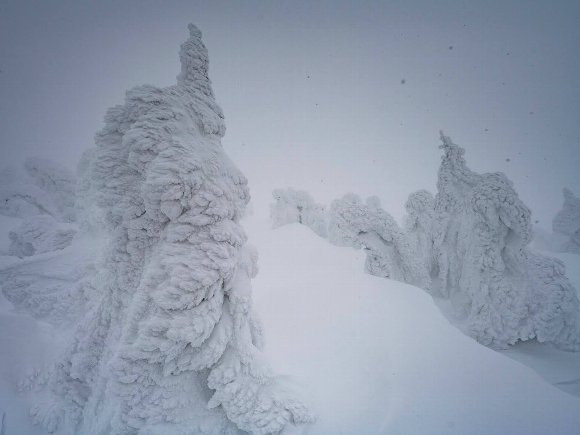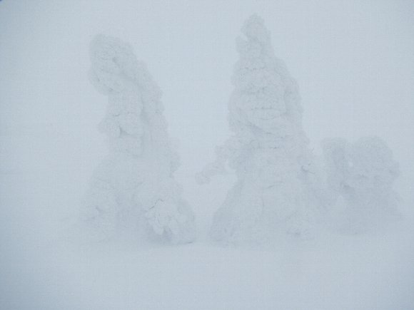 少し歩くと霧も薄くなり 樹氷が見えてきた |
