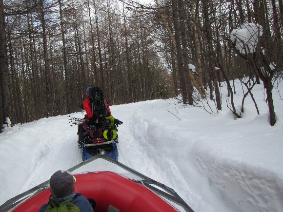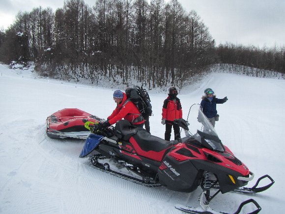 8人のりのラフティングボートだが雪上を引くので 重量制限で 4人のり