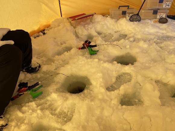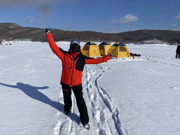 ![]() 晴天の岩洞湖で わかさぎ釣り |