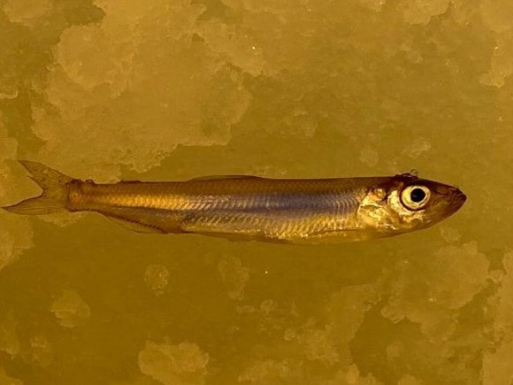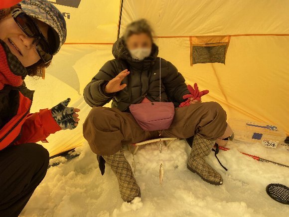 ![]() ハルが初めて釣ったワカサギ 大物だ〜(笑) 何と3匹も釣れた! |