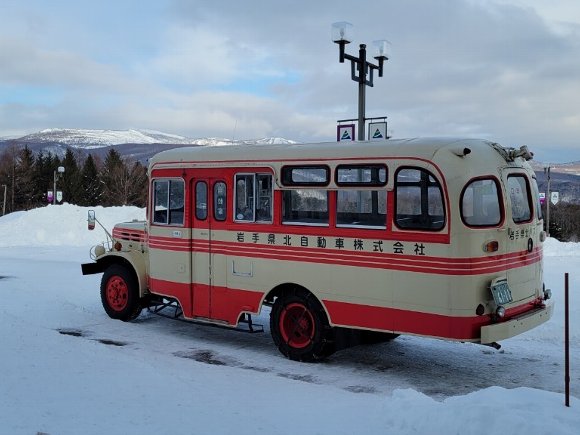 ![]() 雪の中 時代物のボンネットバスが走っている |