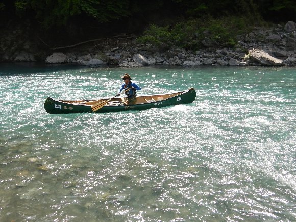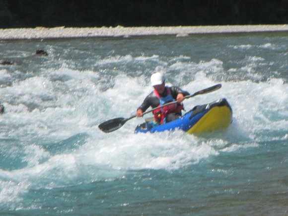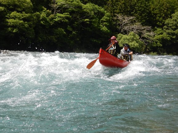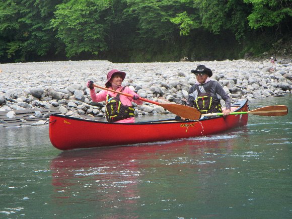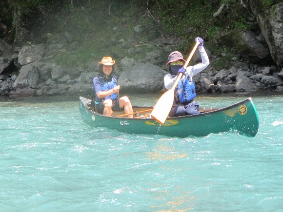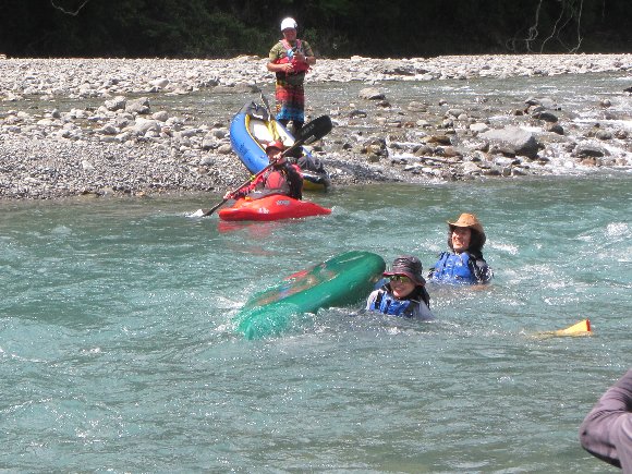 | . スタート直後 後ろから 「きゃー」 という声が・・・・ 川下り初めてのS夫妻、 岩にひっかかり 漕ぎ始めに いきなり 沈! . |