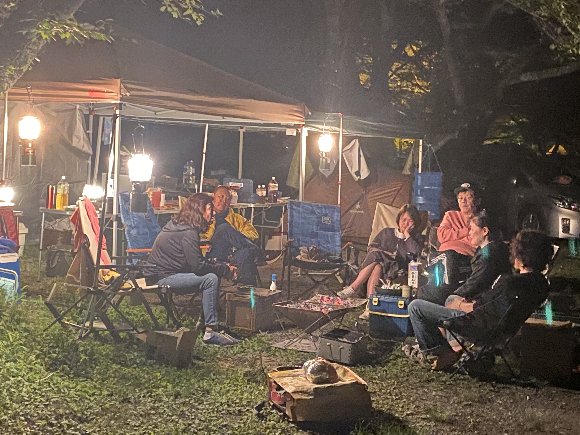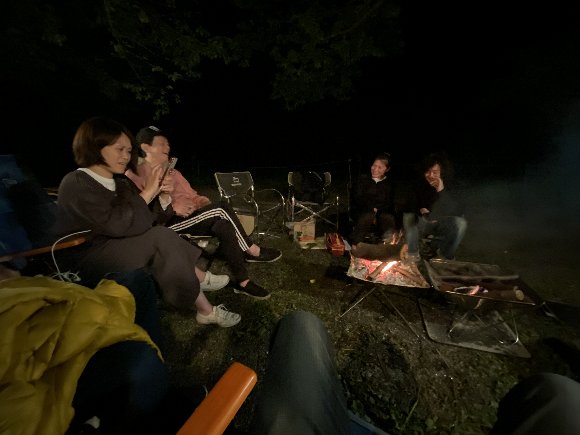 ![]() 食後は、たき火を囲み |