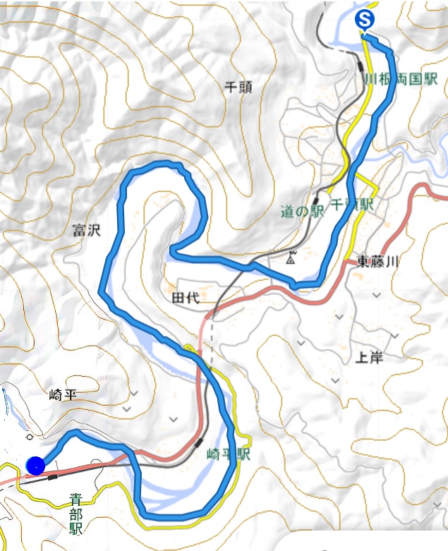 この日の漕艇コース . 両国橋から青部までの漕艇距離は約10km 漕艇時間 1時間30分 (休憩なし) . 自転車回送距離は、約 5Km 回送時間 1時間20分 (トーマスフェア見学、昼食含む) 実質 40分ほど . 道路は、ほぼ真っ直ぐだが、 川は、大きく曲がりくねっているので、 距離は、大きな差がある。 |