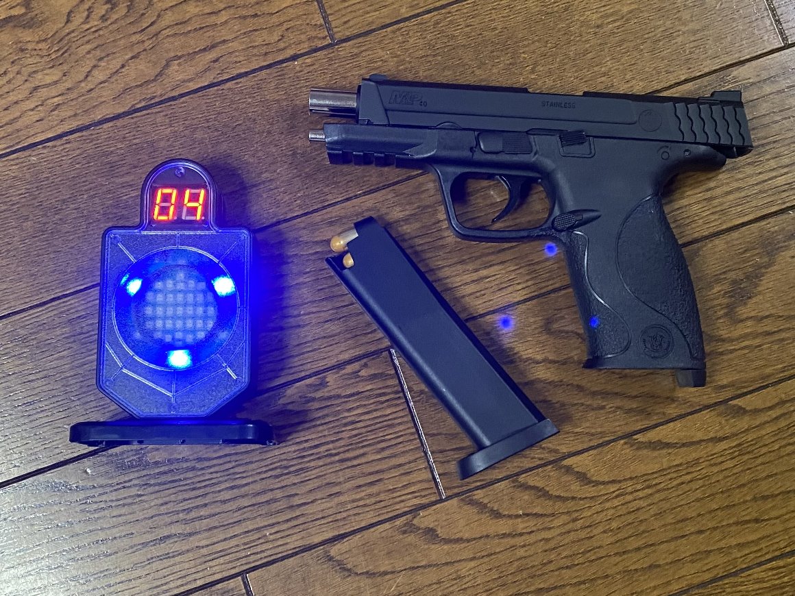 銃口から 赤いレーザーがでて、 的に当たると びっこ〜ン と 音が出る 中国製