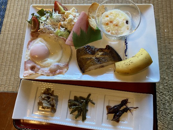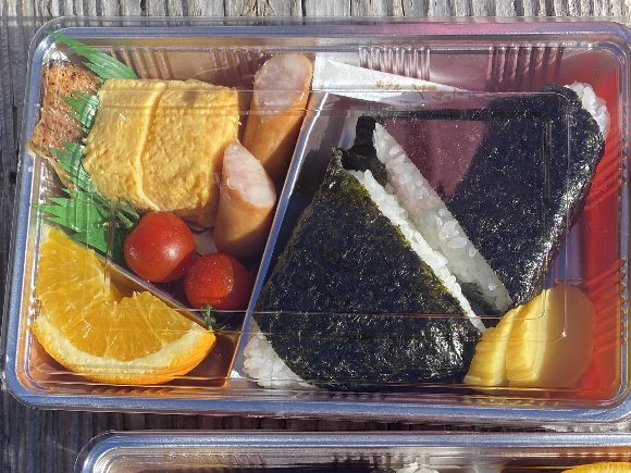 宿で作ってもらった 朝食 千畳敷駅前の広場で食べる |