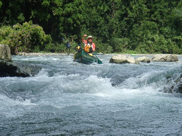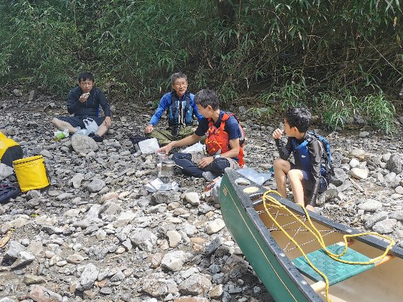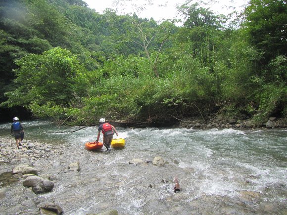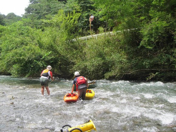 倒木が水路を塞ぐ 艇を引き 歩く |
