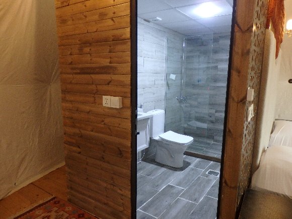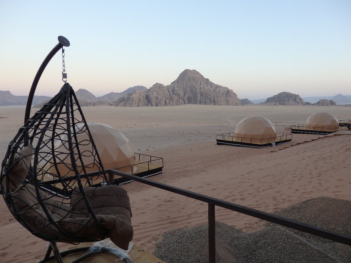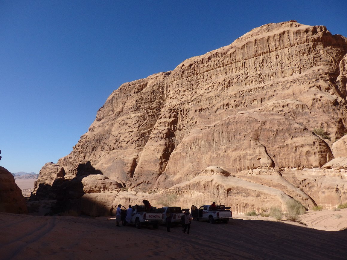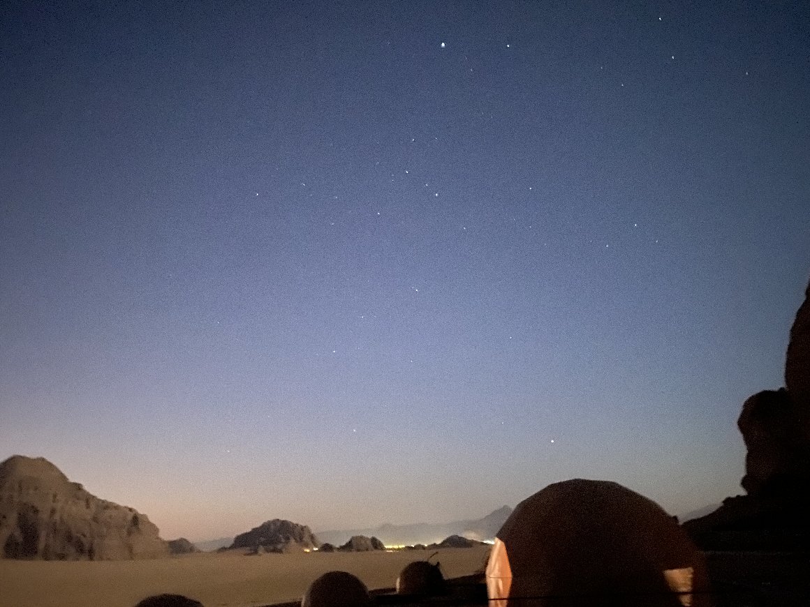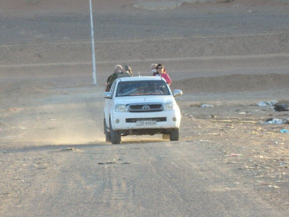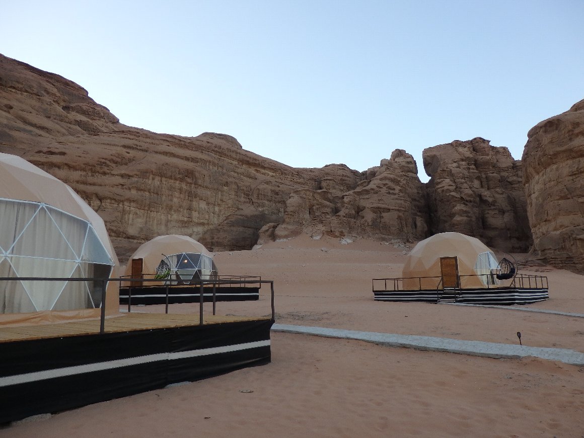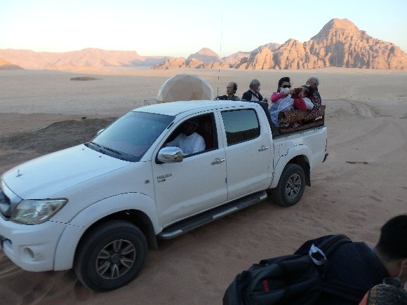専用バス、4WD車の乗り継ぎで6時間 18時ごろ ワディ・ラム砂漠 ハサン・ザワイデ・キャンプに到着