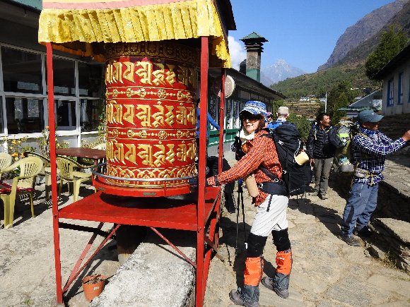 ルクラの街で マニ車を回し 安全祈願 |
