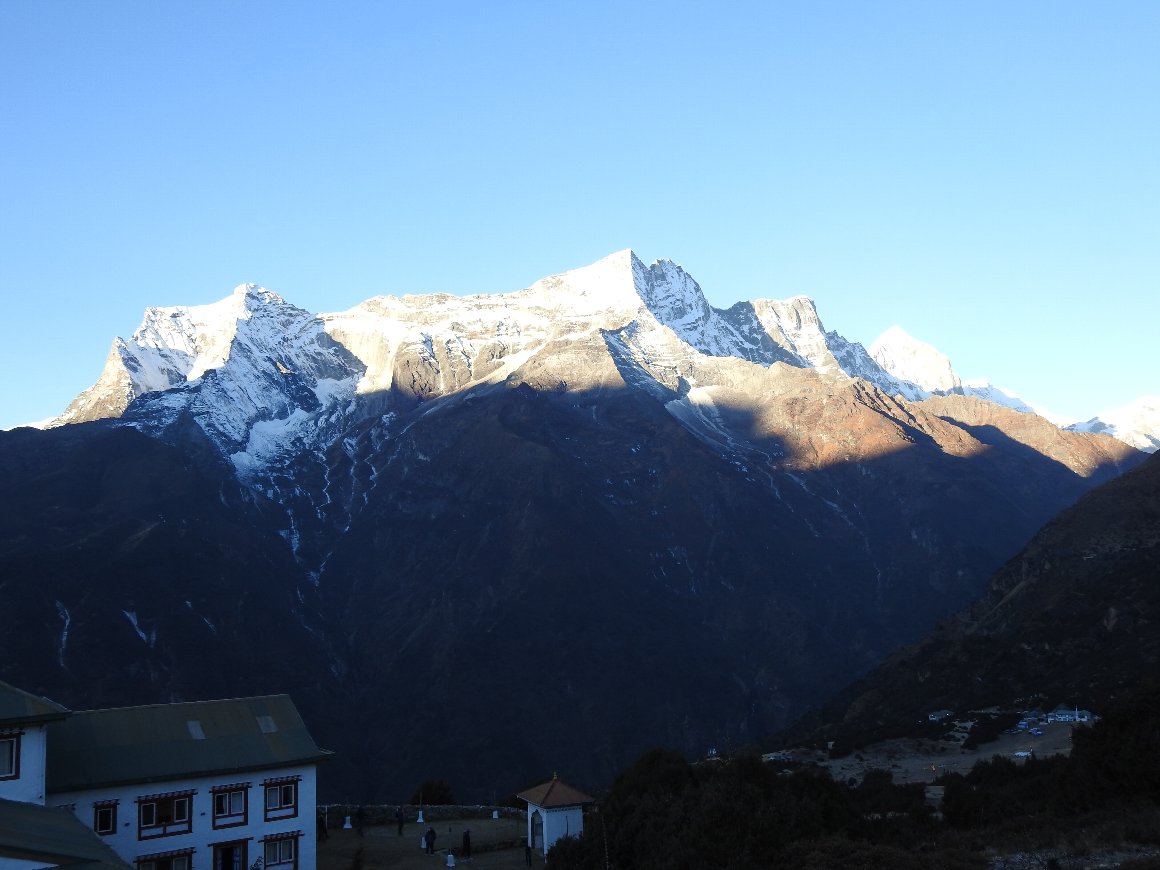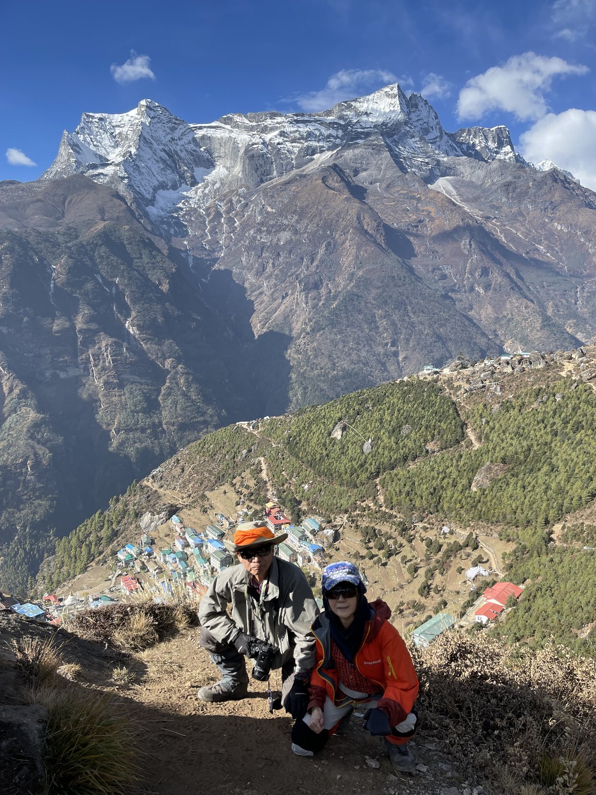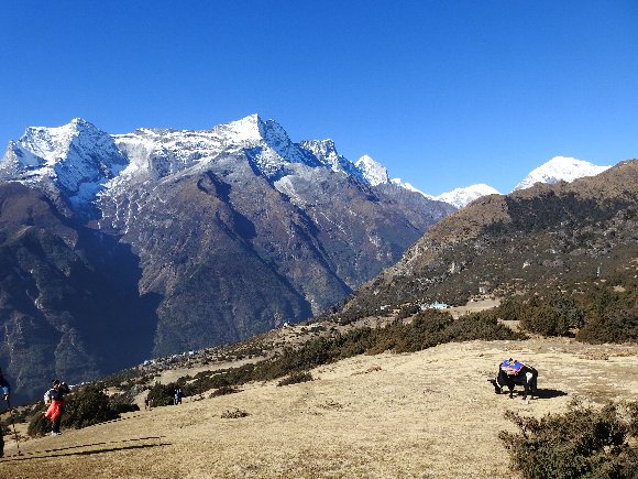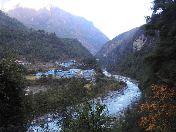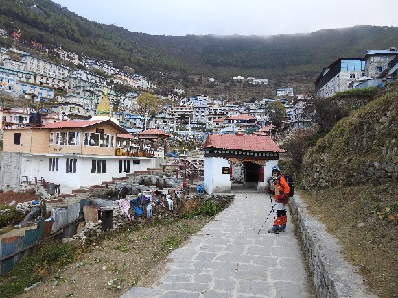 ジャンボチェの丘への途中 ナムチェバザールを見下ろす 後ろの山はコンデリ . |