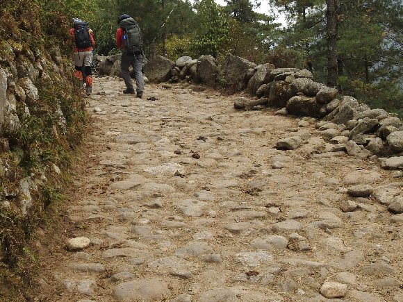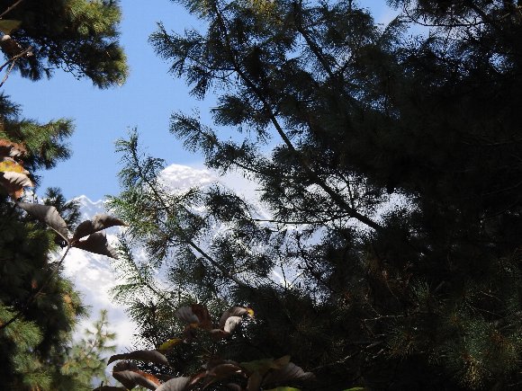 二重橋を渡った後の急坂を上り続け 木立に先にエベレスト山頂! |