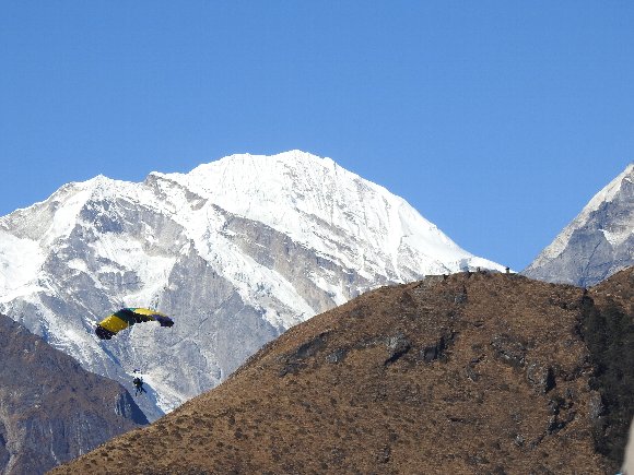 雲の切れ目から テンボジェの村 この ず〜っとず〜っと先に エベレストベースキャンプ(5,364m)がある |